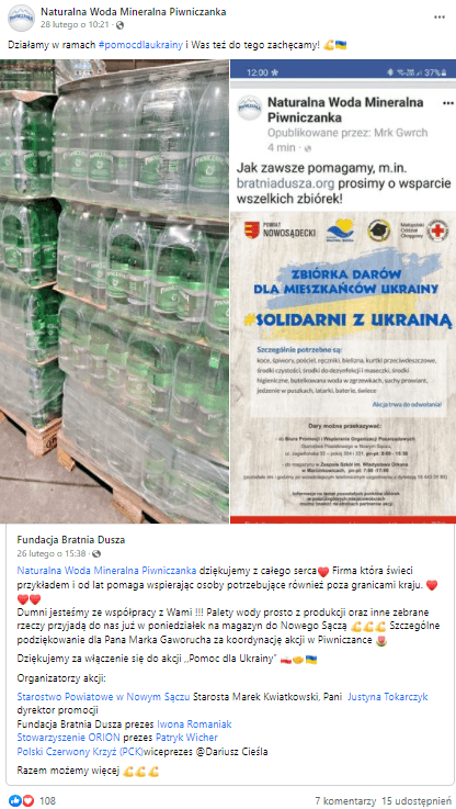 Warto w tym kontekście zwrócić uwagę na aktywność takich marek, jak Aviko Polska i Piwniczanka. Obie marki ukierunkowały się na społeczną odpowiedzialność, włączając się realnie w pomoc humanitarną za pomocą zbiórek finansowych, zbiórek odzieży czy też innych artykułów wysokiej potrzeby. Piwniczanka włączyła się także w pomoc wysyłając palety swoich własnych produktów do potrzebujących. Nie bez znaczenia są także zwykłe (ale jednoznaczne) słowa wsparcia i różnego rodzaju akty solidarności z ludźmi, których na różne sposoby dotknęło piekło wojny. Dobrą reakcją będzie także osadzenie wsparcia w kontekście lokalnym, zwłaszcza jeśli dana marka jest związana z określonym obszarem. Takie działania podjęła na przykład piekarnia SPC Smacznego Warszawo, która informuje o tym, jak w pomoc Ukrainie można włączyć się na terenie stolicy Polski.
