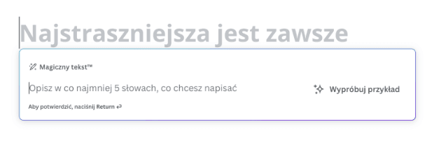W dobie fascynującego rozwoju ChatuGPT nikogo nie powinno dziwić, że sztuczna inteligencja zaimplementowana w Canvie pozwala także na tworzenie tekstów na podstawie prostych wskazań. Ich jakość oczywiście nie zawsze będzie zadowalająca, ale – jak sama nazwa wskazuje – mówimy o funkcji, która stale się „uczy”, a więc jej jakość będzie tylko się podnosić. Warto jednak wykorzystać funkcję „Magiczny Tekst” i zobaczyć, co ma do powiedzenia na zadany przez nas temat.